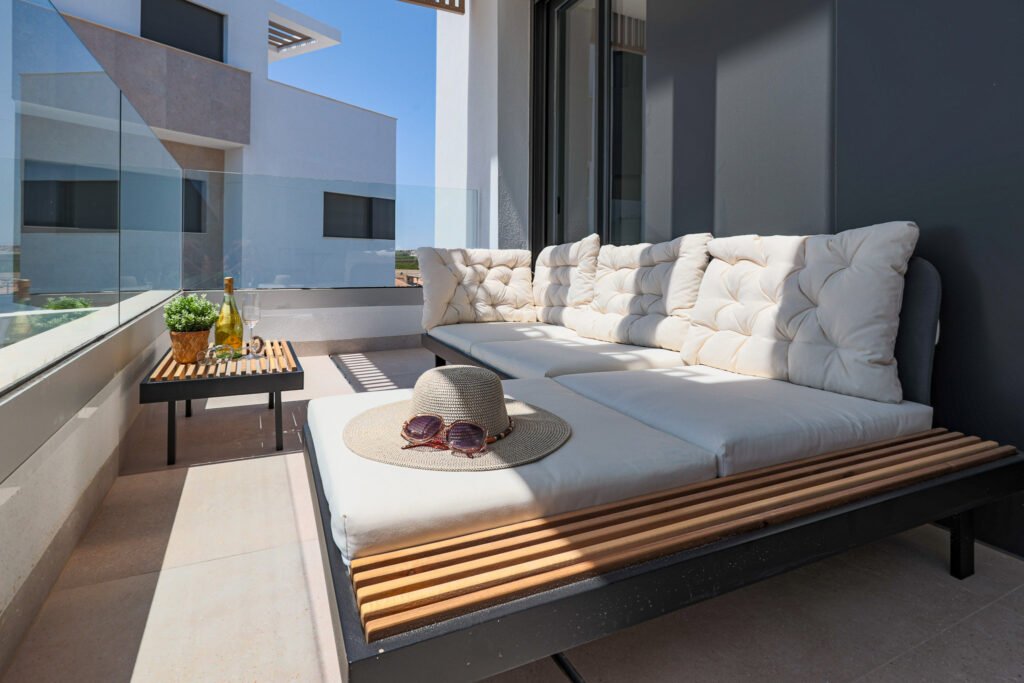 • Balkon met loungebank en zitje – Perfect om buiten te relaxen en te genieten van het mooie weer.